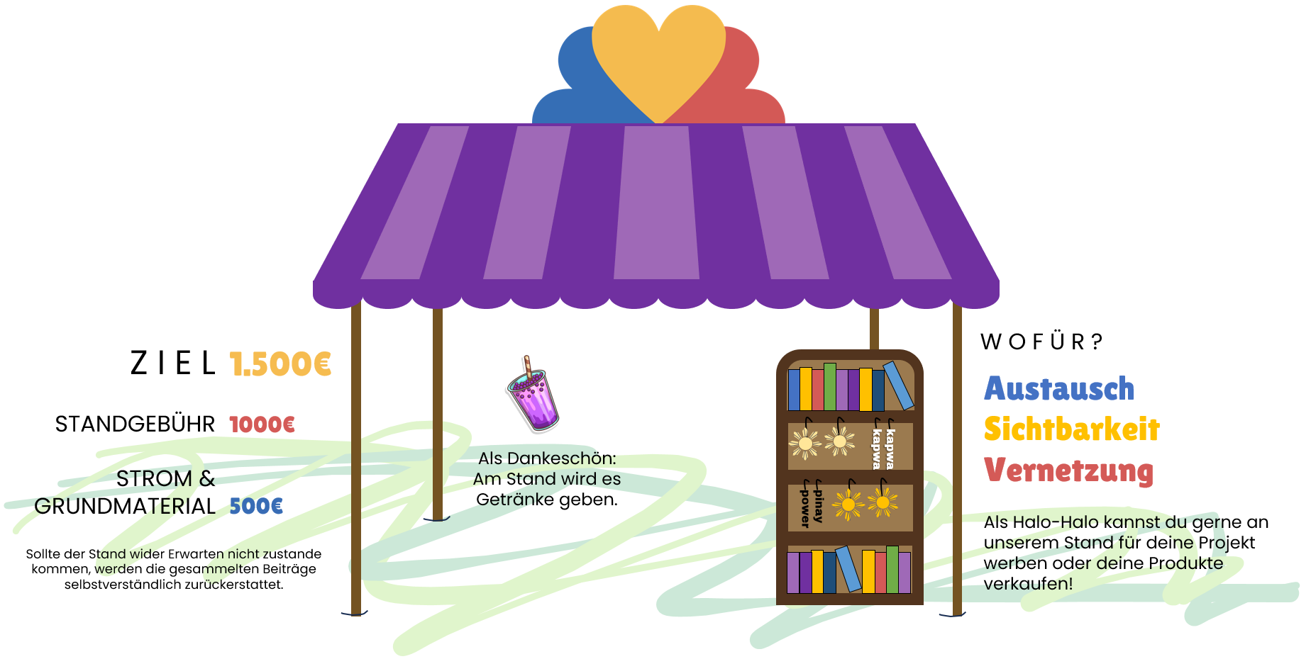 Hinweis: Wir sind kein eingetragener Verein und können daher keine Spendenquittungen ausstellen. Die Unterstützung ist freiwillig und nicht steuerlich absetzbar. Sollte der Stand wider Erwarten nicht zustande kommen, werden die gesammelten Beiträge selbstverständlich zurückerstattet.
